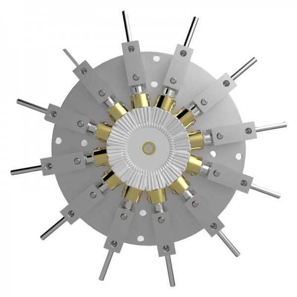 This is an example of a Carousel drive using our Bevel Gears to give multiple rotating spindles plus rotation of the carousel itself. Although this example has 12 spindles, it is also possible to have 2, 3, 4, 6 or 8 equi-spaced shafts. All the parts used are available on our site.
