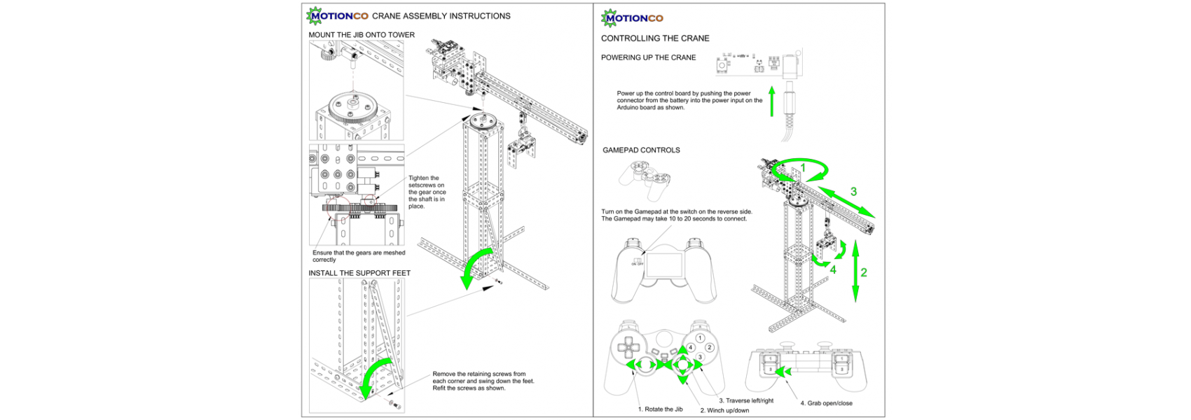 The fully assembled crane comes with a Bluetooth equipped Arduino Board/Motor Shield and compatible Bluetooth Gamepad. It is programmed and ready to go after some basic assembly. It also includes the powered Grab.